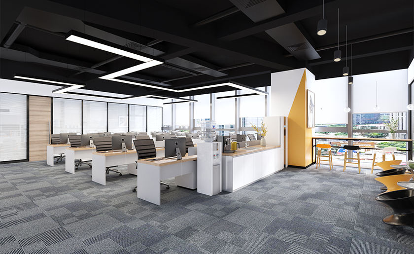采用“减法设计”降低硬装成本,顶面裸露管线刷漆搭配线性灯,墙面选环保乳胶漆局部点缀,地面用PVC锁扣地板或局部方块地毯平替高端石材。尚泰装饰的模块化设计可实现空间灵活复用,如折叠会议桌兼顾开会与临时工作需求,玻璃隔断打造通透感的同时节省建材费用。